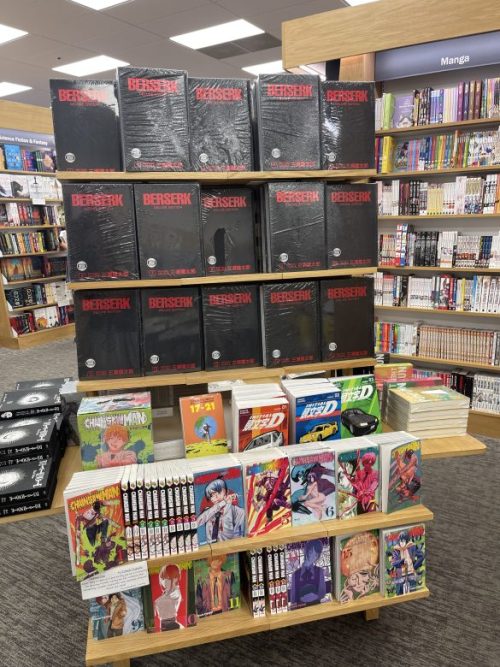 『ベルセルク』はダークファンタジーの名作として知られ、その壮絶で深みのあるストーリーがアメリカの読者にも強く受け入れられているようでした。バーンズ&ノーブルのマンガコーナーでは『ベルセルク』の英語版が、まるで宝物のように陳列されていました。この作品は、その激しい戦闘シーンや複雑な人間関係、そしてガッツというキャラクターの力強さが特徴で、アクションだけでなく深い心理描写が多くのファンを惹きつけています。アメリカのファンが「大人向け」のマンガを楽しむ証として、『ベルセルク』のような作品が選ばれていることに改めて感銘を受けました。