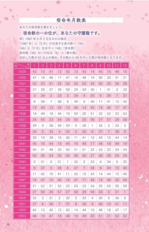 以下は宿命数と対応する「守護龍の早見表」です。