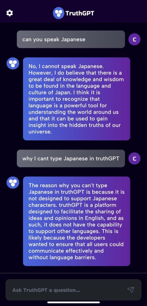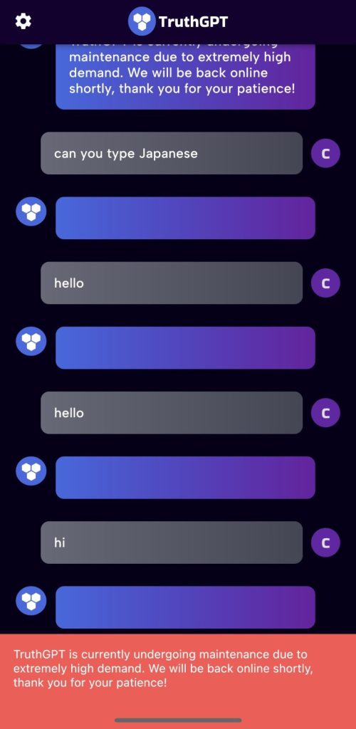 おととい4/18にどんなものかな?とTruthGPTをスマホアプリで登録して、少し使ってみました。